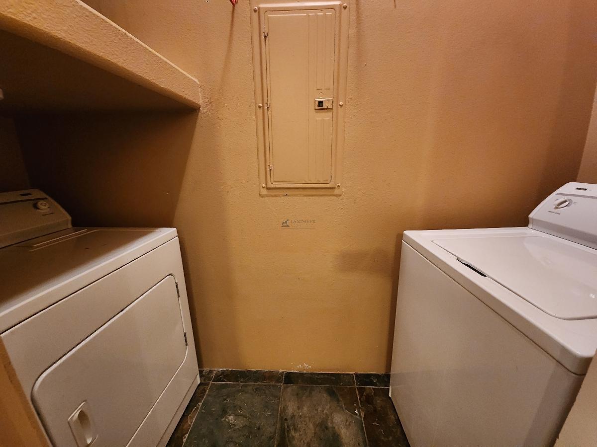 Living space is accentuated by a gas fireplace to add warmth and ambiance, making it an ideal gathering spot during cooler evenings. The living room opens out to a private patio, offering an intimate outdoor living or dining space. Essential conveniences are well integrated, including an in-unit washer and dryer setup.
